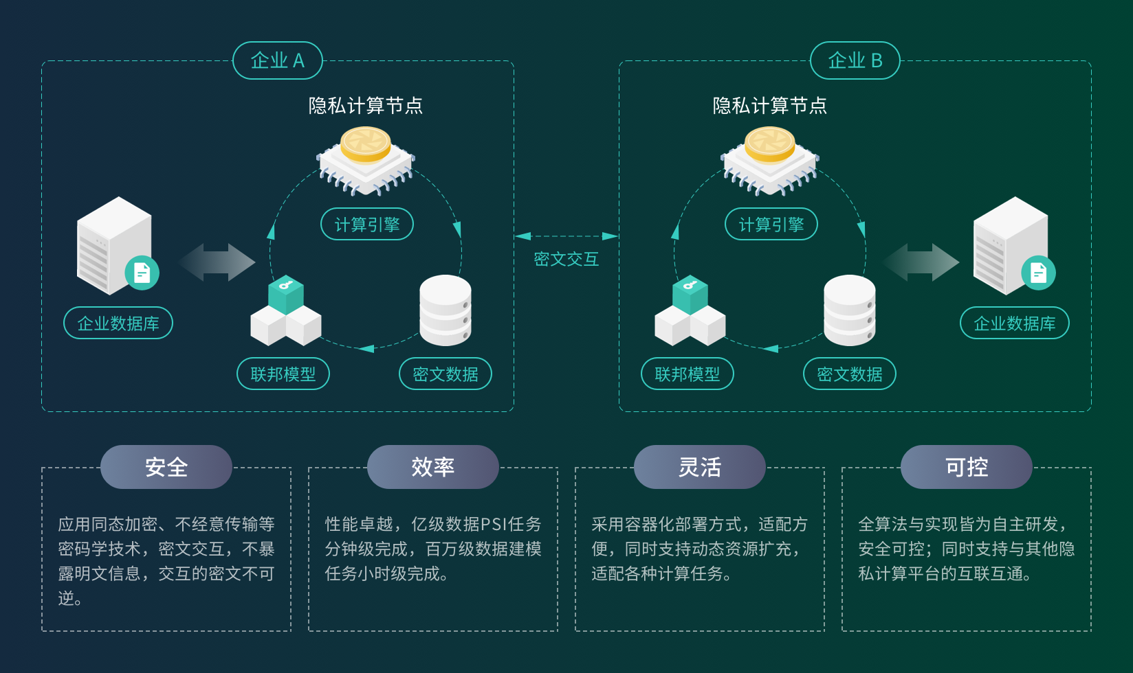 内嵌隐私计算组件, 利用密码学技术,可保证不暴露明文信息的情况下,满足密级数据使用需求。