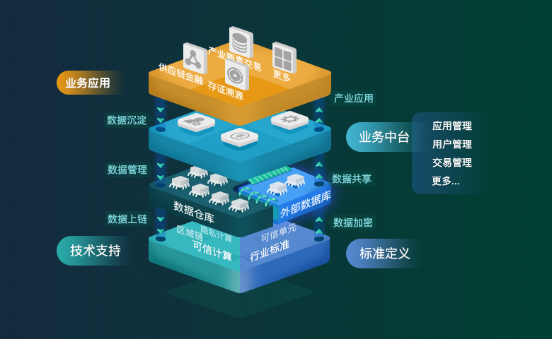 建多方数据通道,打破数据壁垒,实现原始数据不出域,数据输入、运算、结果输出全流程密态保护。促进产业内不同主体之间的标准共识、链上协议和数字化协作,赋能资产确权、内部管理、贸易和结算等业务场景。