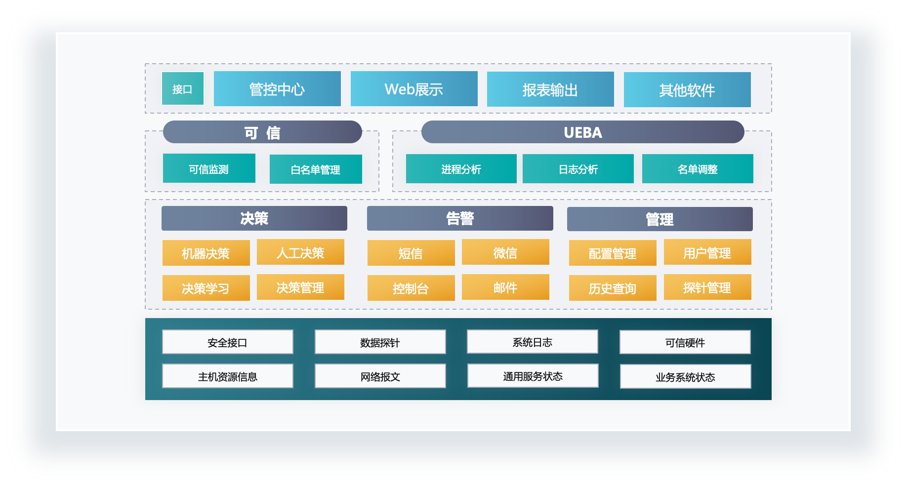 1、基于可信计算和白名单技术,遵循《等保2.0》,实现安全态势感知。