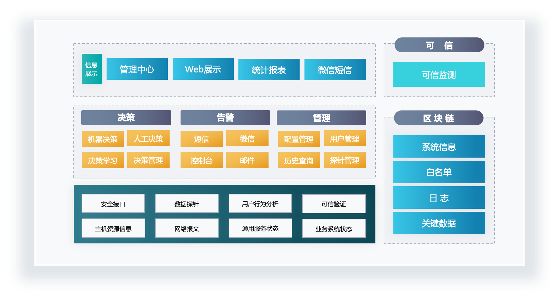 平台由可信防护模块和以区块链为底层的数据安全模块两大核心模块构成,主要实现以下三个功能: